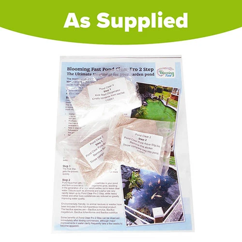 Pond Clear Pro 2 Step consists of two parts, Kick Start and Pure Aqua which contains specially prepared materials encapsulated with selected strains of bacterial cultures. These attract dispersed particles in your pond and form a core on which the organisms grow, assisting in the generation of sludge which settles out to leave clear water.