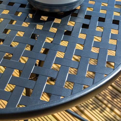 An attractive bistro set with a traditional lattice design. Constructed from strong steel, with a matt black powder coated finish.
