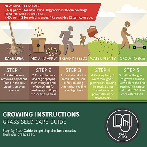 - Mix up the seeds and begin applying them evenly at a rate of 60g per m2 for new lawns, or 40g per m2 for existing areas.